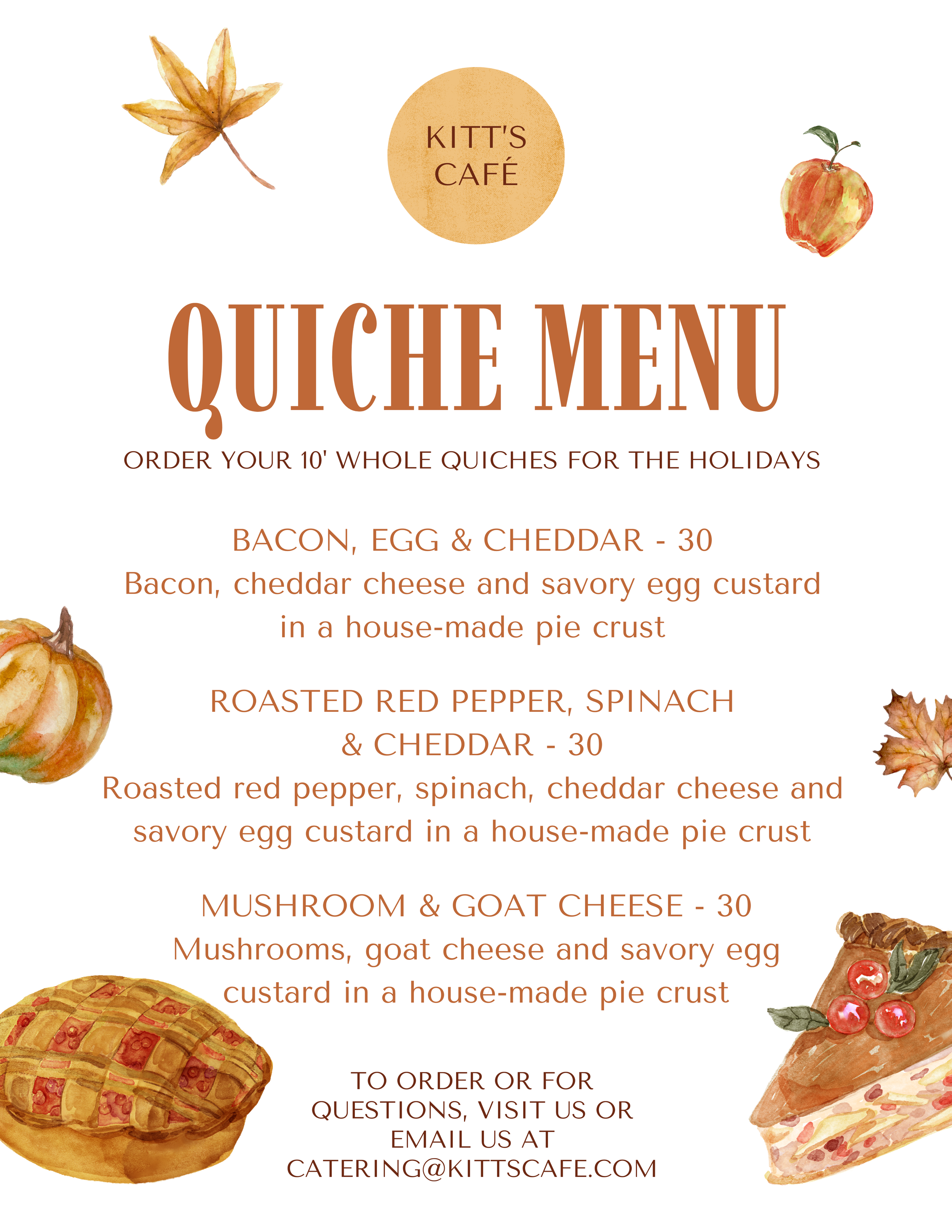Have something in mind not listed here? Let us know! We might be able to make it! If you have questions about catering, please email catering@kittscafe.com or call 484-277-2699 and leave a voicemail.